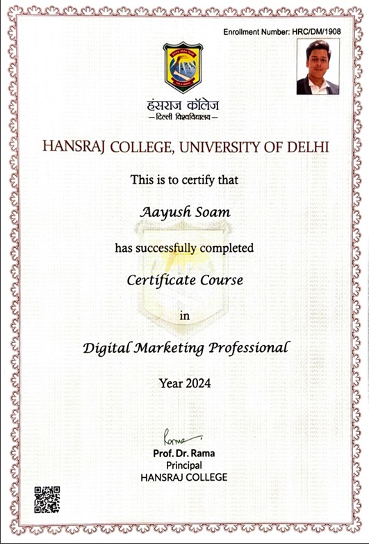 I’m excited to announce that I’ve earned the Digital Marketing Certification from Hansraj College! This certification has equipped me with cutting-edge skills in SEO, content strategy, social media management, and data-driven marketing, empowering me to create impactful campaigns that drive engagement and growth.