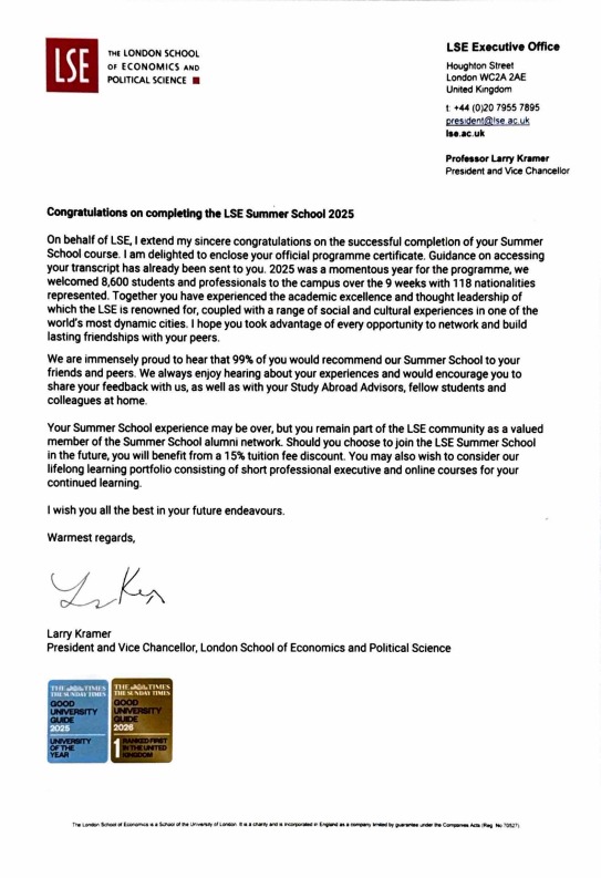 I’m excited to announce that I’ve earned a certificate from the London School of Economics and Political Science Summer School 2025.